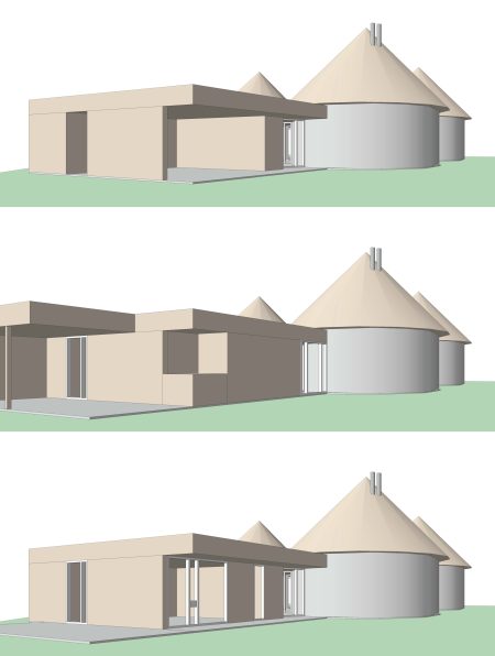 Conceptueel bestaat het ontwerp uit drie cirkels bijeengehouden door een ‘rechthoekige’ dak- en vloerplaat. Geheel in de geest van het structuralisme is het plan opgezet op een raster van vierkanten, in dit geval met zijden van 1,25m. De cirkels hebben diameters van 7,5m (6x); 6,25m (5x) en 5,0m (4x). In het vroege modernisme (Van der Rohe, Rietveld e.a.) zijn de relaties tussen binnen, buiten en alle mogelijke variaties daartussen belangrijk geworden. Ook bij dit relatief introverte huis zijn deze overgangen heel zorgvuldig vormgegeven.